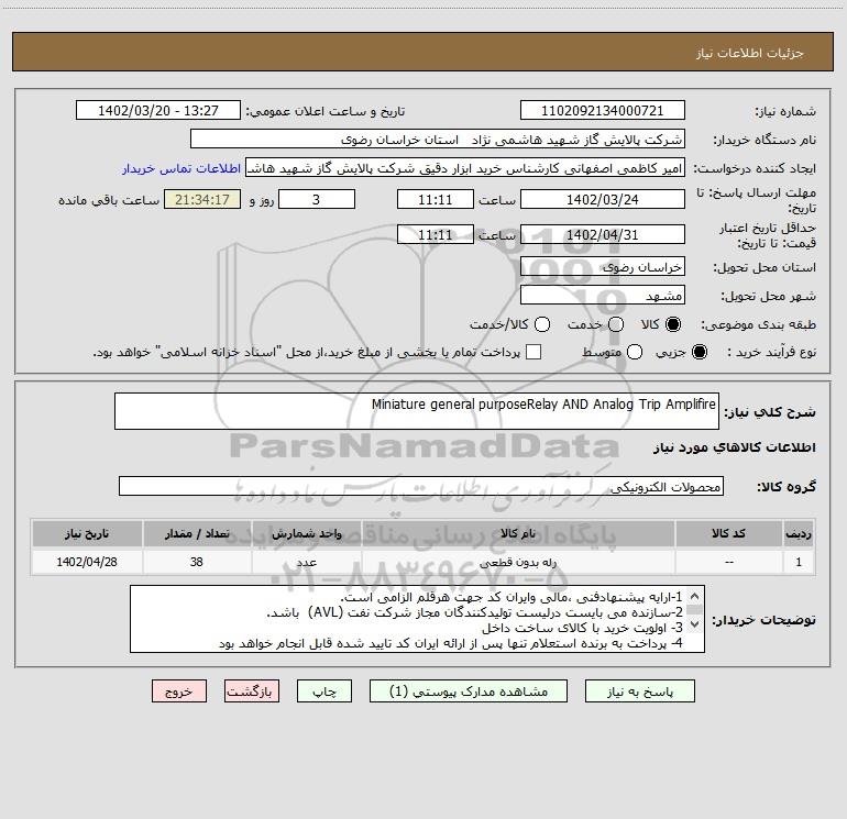 شرح کلی نیاز: Miniature general purposeRelay AND Analog Trip Amplifire