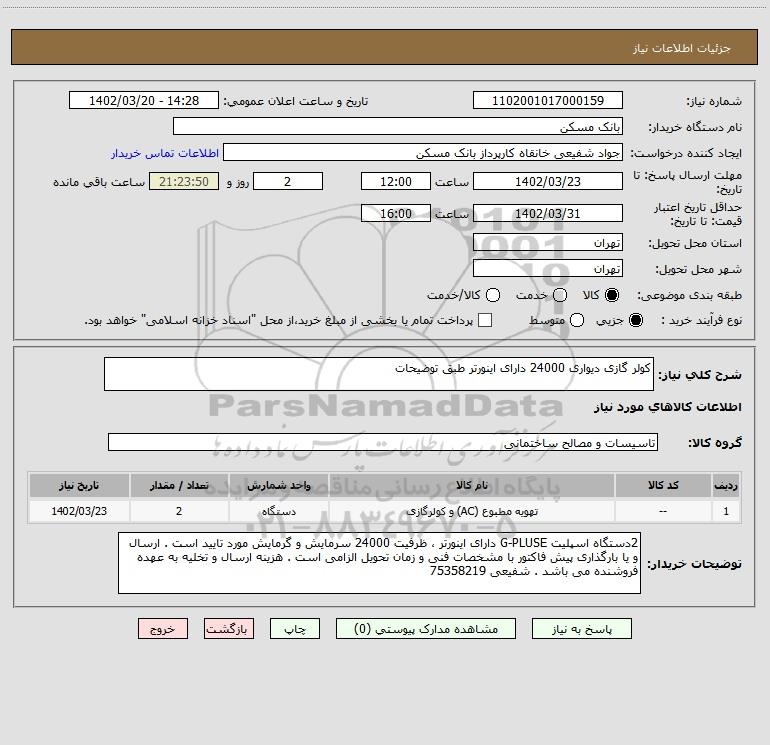 شرح کلی نیاز: کولر گازی دیواری 24000 دارای اینورتر طبق توضیحات