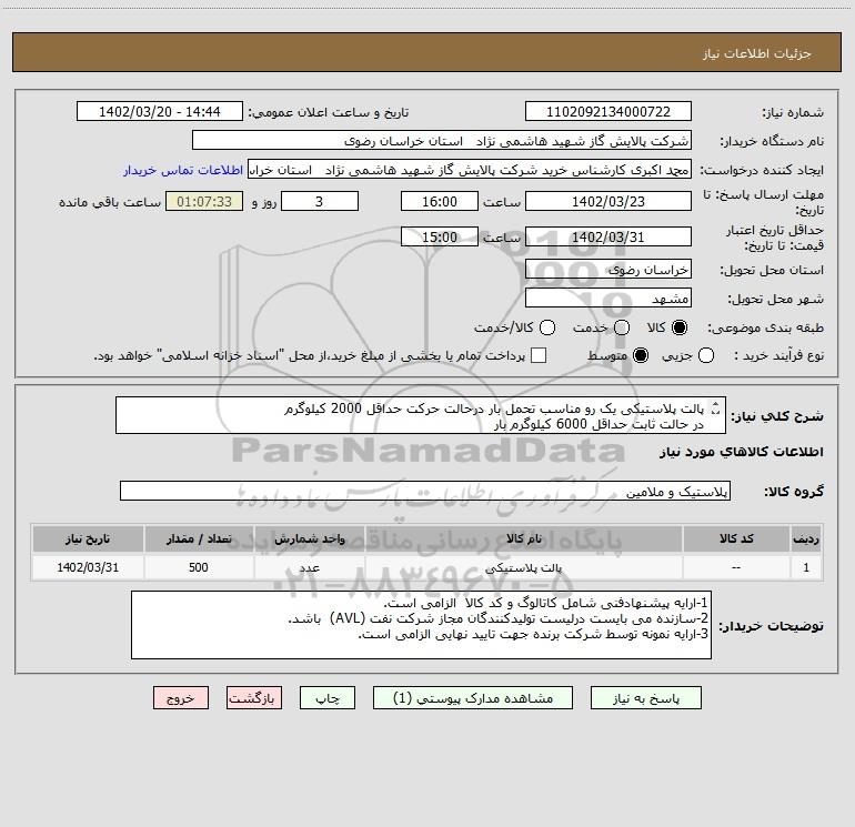 | 1 | -- | پالت پلاستیکی | عدد | 500 | 1402/03/31 |