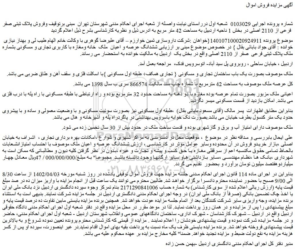 شماره پرونده اجرایی 0103029 شعبه اول درراستای نیابت واصله از شعبه اجرای احکام مدنی شهرستان تهران مبنی برتوقیف وفروش پلاک ثبتی صفر فرعی از 2110 اصلی در بخش 1 ناحیه اردبیل به مساحت 42 متر مربع به ادرس ذیل و نظریه کارشناسی بشرح ذیل اعلام گردید