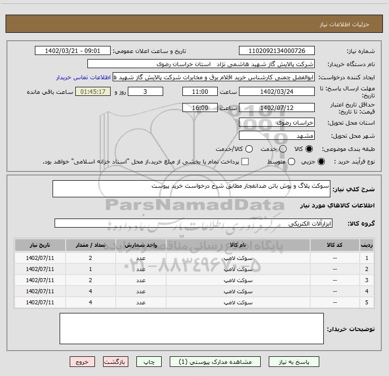 نام دستگاه خریدار:شرکت پالایش گاز شهید هاشمی نژاد استان خراسان رضوی