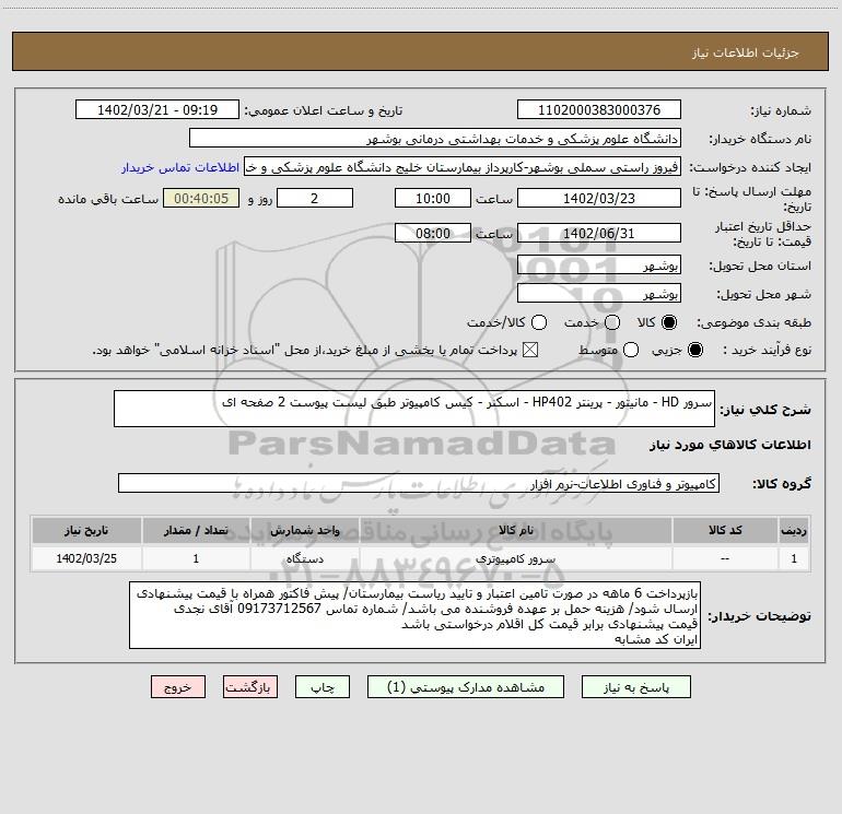 شرح کلی نیاز: سرور HD - مانیتور - پرینتر HP402 - اسکنر - کیس کامپیوتر طبق لیست پیوست 2 صفحه ای
