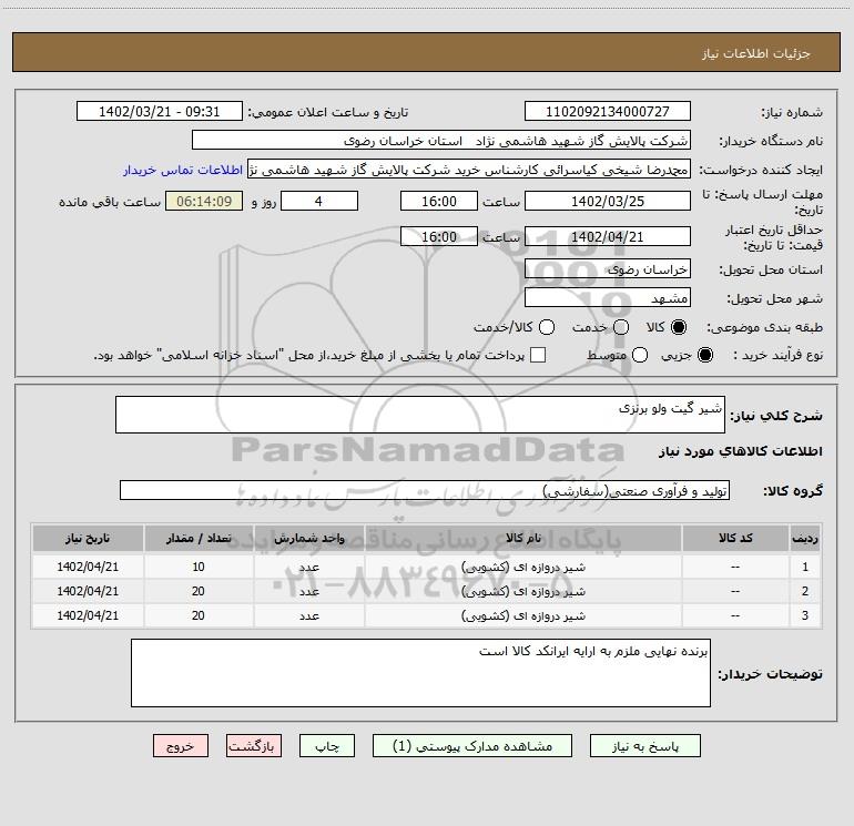 نام دستگاه خریدار:شرکت پالایش گاز شهید هاشمی نژاد استان خراسان رضوی