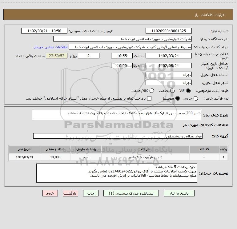 شرح کلی نیاز: شیر 200 سی سی تتراپک-10 هزار عدد -کالای انتخاب شده صرفا جهت تشابه میباشد