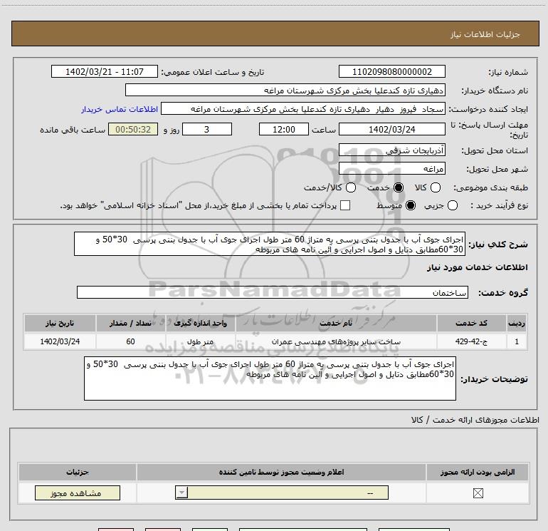 شرح کلی نیاز: اجرای جوی آب با جدول بتنی پرسی به متراژ 60 متر طول اجرای جوی آب با جدول بننی پرسی 30*50 و 30*60مطابق دتایل و اصول اجرایی و آئین نامه های مربوطه