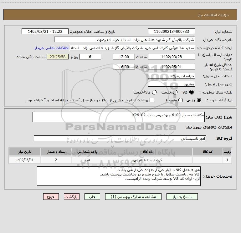 شرح کلی نیاز: مکانیکال سیل 6100 جهت پمپ مدل KP6102