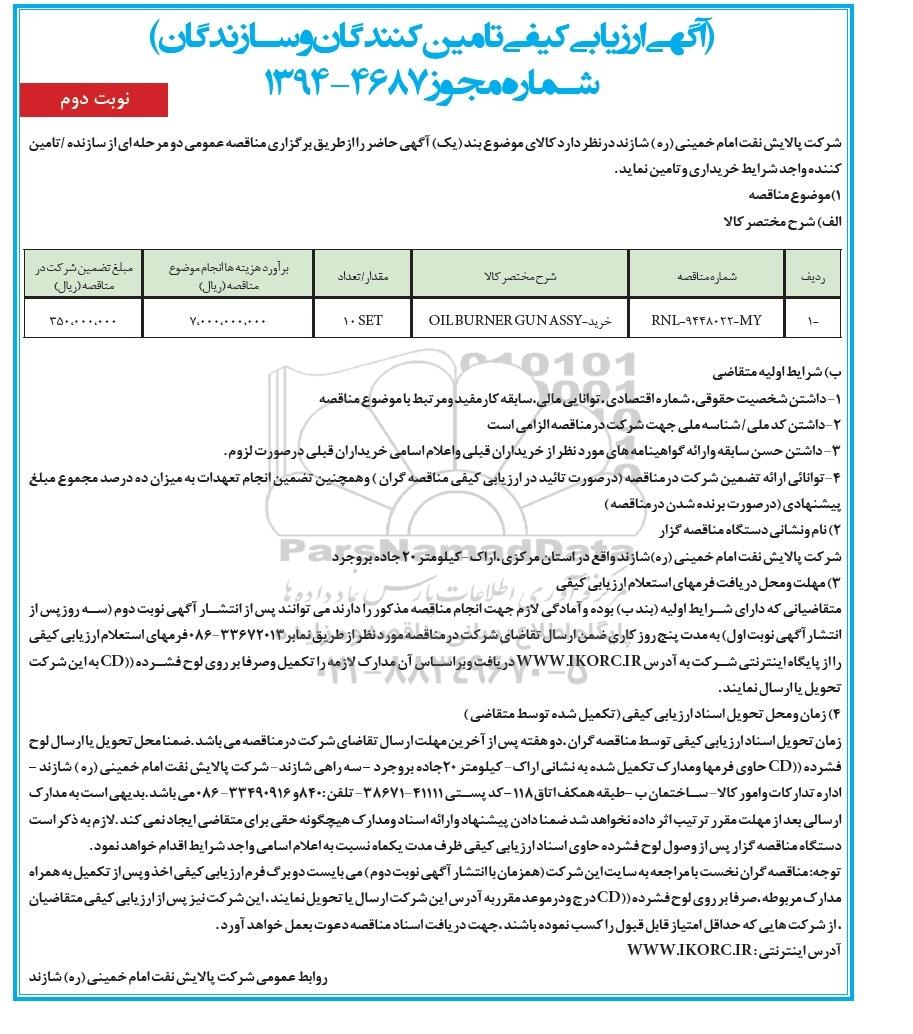 ارزیابی کیفی خرید OIL BURNER GUN ASSY نوبت دوم , آگهی ارزیابی کیفی تامین کنندگان و سازندگان ,مناقصه خرید OIL BURNER GUN ASSY