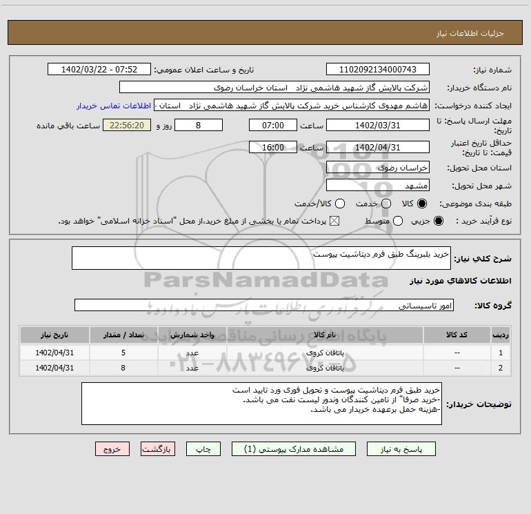 نام دستگاه خریدار:شرکت پالایش گاز شهید هاشمی نژاد استان خراسان رضوی