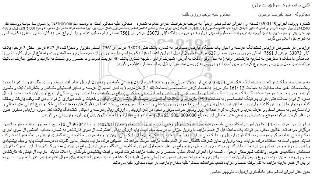 شماره پرونده اجرایی0200149 شعبه اول اجرای احکام مدنی اردبیل به موجب درخواست اجرای حکم به شماره محکوم علیه محکوم است به پرداخت مبلغ 3/457/500/000 ریال بعنوان اصل خواسته وپرداخت مبلغ 118442500 ریال هزینه دادرسی و خسارت تاخیر تادیه از تاریخ تقدیم دادخواست مورخ 1401/01/31 لغایت زمان اجرای حکم بر اساس شاخص اعلامی بانک مرکزی که از سوی دایره اجرا محاسبه خواهد شد در حق محکوم له و مبلغ 172/875/000ریال از بابت نیم عشر دولتی در حق صندوق دولت ،باتوجه به درخواست محکوم له مبنی برتوقیف و فروش پلاک ثبتی 33073 فرعی از 7561 اصلی بنام محکوم علیه و با ارجاع امر به کارشناسی ،نظریه کارشناسی به شرح ذیل اعلام می گردد.