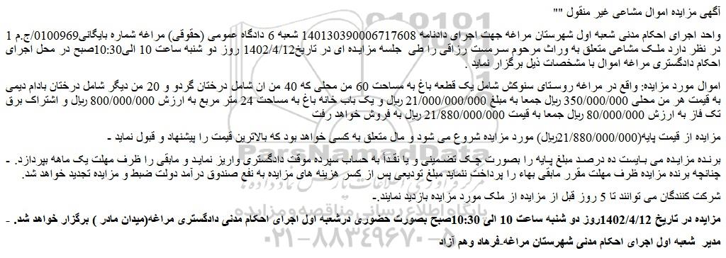 - مزایده در تاریخ 1402/4/12روز دو شنبه ساعت 10 الی 10:30صبح بصورت حضوری درشعبه اول اجرای احکام مدنی دادگستری مراغه(میدان مادر ) برگزار خواهد شد.