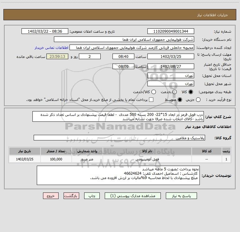 | 1 | -- | فویل آلومینیومی | متر مربع | 100,000 | 1402/03/25 |