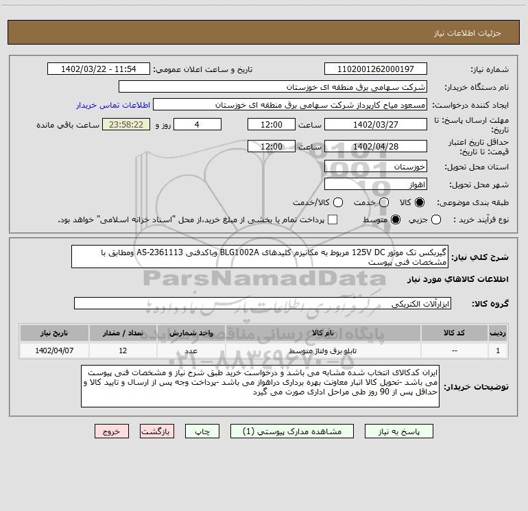 شرح کلی نیاز: گیربکس تک موتور 125V DC مربوط به مکانیزم کلیدهای BLG1002A وباکدفنی AS-2361113 ومطابق با مشخصات فنی پیوست