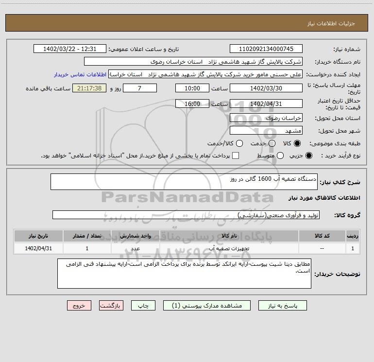 نام دستگاه خریدار:شرکت پالایش گاز شهید هاشمی نژاد استان خراسان رضوی