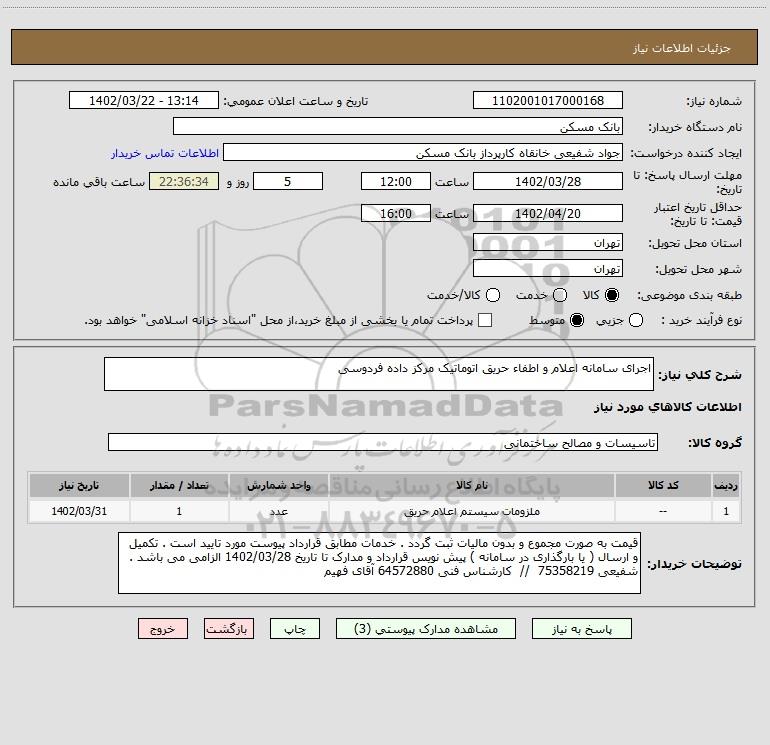 شرح کلی نیاز: اجرای سامانه اعلام و اطفاء حریق اتوماتیک مرکز داده فردوسی