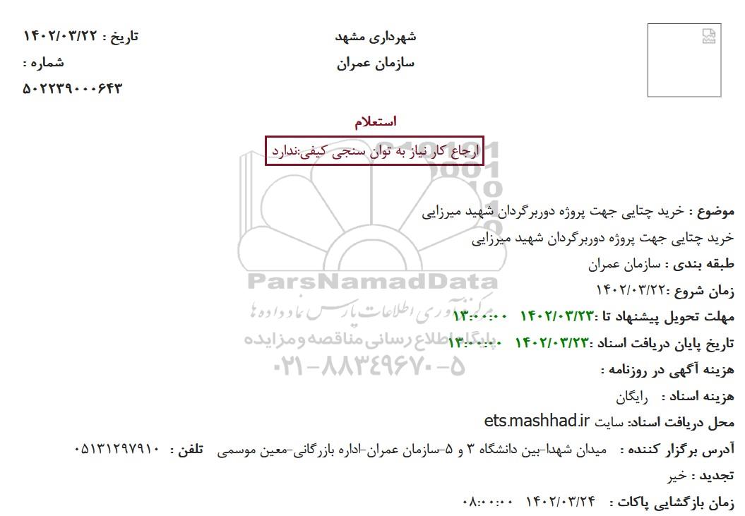 موضوع : خرید چتایی جهت پروژه دوربرگردان شهید میرزایی