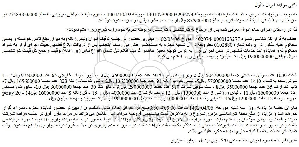 بنابراین جلسه مزایده به روز سه شنبه مورخه 1402/04/06 ساعت 09:00الی9:30صبح در اجرای احکام مدنی دادگستری اردبیل در حضور نماینده محترم دادسرا برگزار خواهد شد و مزایده از مبلغ معینه کارشناسی مزبور شروع و به بالاترین قیمت پیشنهادی فروخته خواهد شد . طالبین می توانند در موعد مقرر فوق در جلسه مزایده شرکت نموده و قیمت پیشنهادی خودشان را اعلام نمایند . مورد مزایده به بالاترین قیمت پیشنهادی واگذار خواهد شد شرط حضور در جلسه مزایده واریز 10 درصد مورد مزایده می باشد و در صورت برنده شدن نسبت به پرداخت مابقی آن حداکثر یکماه مهلت خواهد داشت در صورت عدم واریزی در مهلت مقرره درصد واریزی به نفع صندوق دولت ضبط خواهد شد . ضمناً کلیه مخارج بعهده محکوم علیه می باشد.