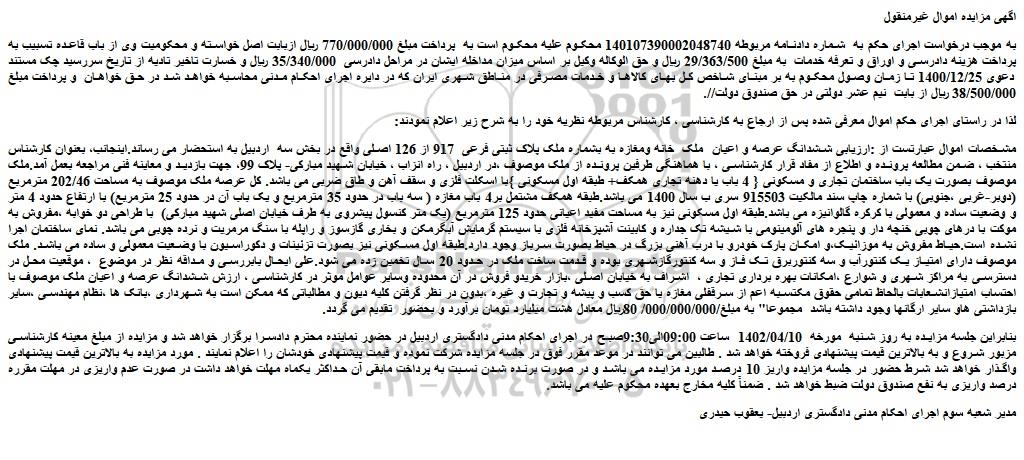 مزایده فروش ششدانگ عرصه و اعیان  ملک  خانه ومغازه به بشماره ملک پلاک ثبتی فرعی  917 از 126 اصلی