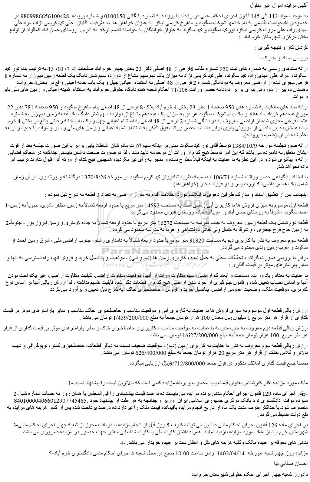 5-مزایده روز چهارشنبه مورخه 1402/04/14 راس ساعت 10:00 صبح در محل شعبه 4 اجرای احکام مدنی دادگستری خرم آباد