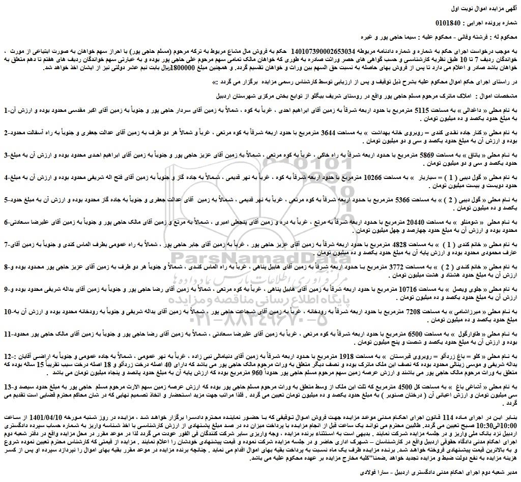 مشخصات اموال : املاک ماترک مرحوم مسلم حاجی پور واقع در روستای شریف بیگلو از توابع بخش مرکزی شهرستان اردبیل