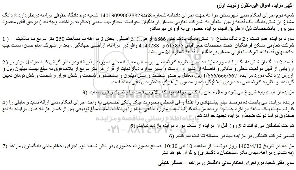 شعبه دوم اجرای احکام مدنی شهرستان مراغه جهت اجرای دادنامه شماره 140130990028823468 شعبه دوم دادگاه حقوقی مراغه درنظردارد 2 دانگ مشاع از شش دانگ یک قطعه زمین متعلق به شرکت تعاونی مسکن فرهنگیان بخواسته محکومیت مدنی (حکم به پرداخت وجه نقد ) درحق آقای مقصود مهرپرور بامشخصات ذیل ازطریق انجام مزایده حضوری به فروش میرساند: