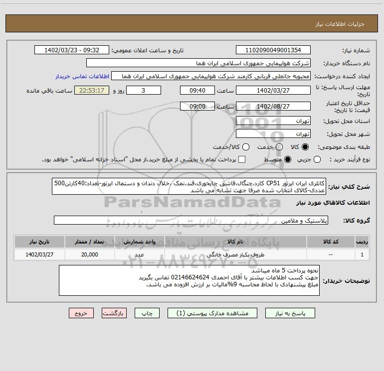 شرح کلی نیاز: کاتلری ایران ایرتور CP51 کارد،چنگال،قاشق چایخوری،قند،نمک ،خلال دندان و دستمال ایرتور-تعداد:40کارتن500 عددی-کالای انتخاب شده صرفا جهت تشابه می باشد
