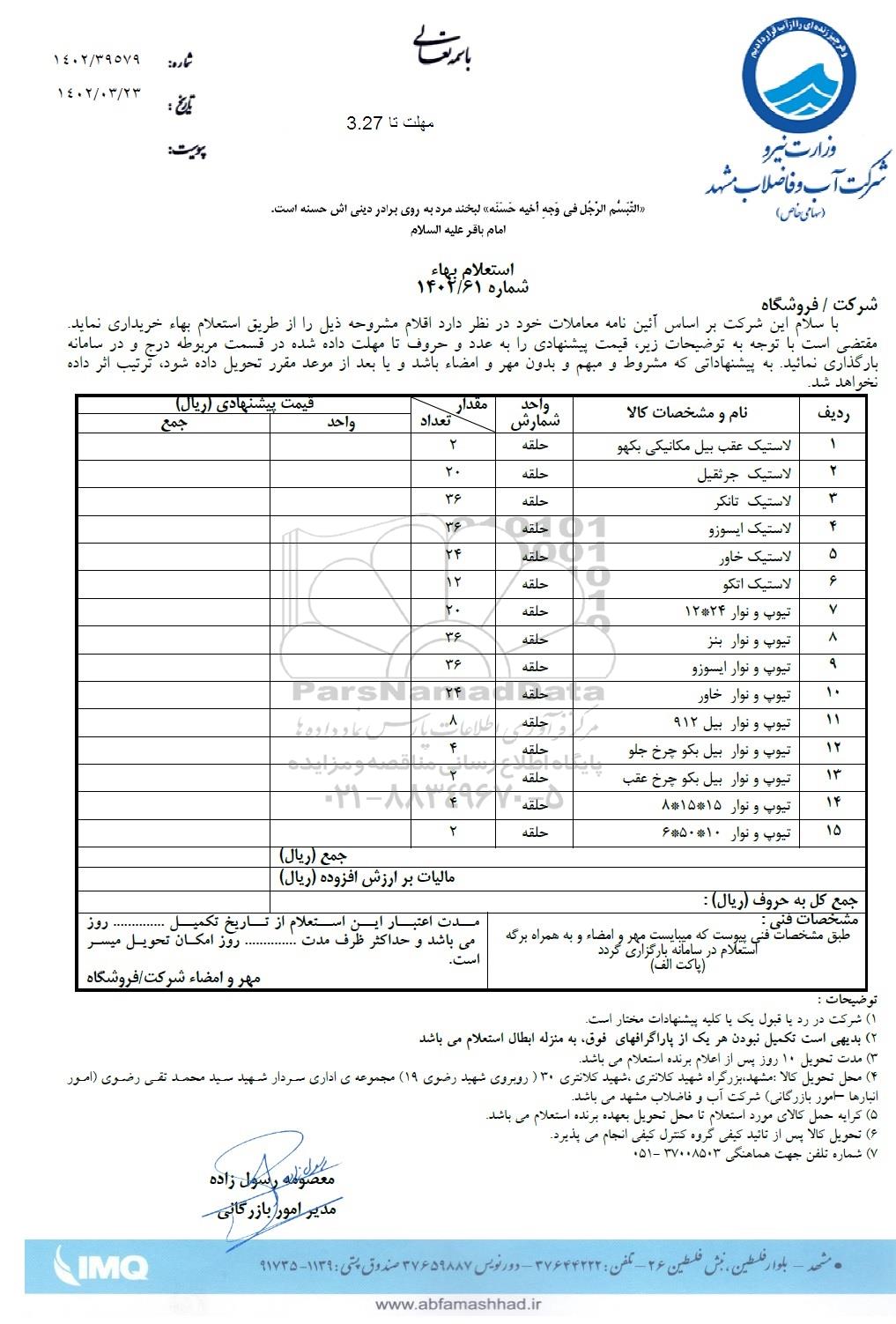 با سلام این شرکت براساس آئین نمه معاملات خود در نظر دارد اقلام مشروحه ذیل را از طریق استعلام بها خریداری نماید مقتضی است با توجه به توضیحات زیر قیمت پیشنهادی را به عدد و حروف تا مهلت داده شده در قسمت مربوطه درج و در سامانه بارگذاری نمائید به پیشنهاداتی که مشروط و مبهم و بدون مهر و امضا باشد و یا بعد از موعد مقرر تحویل داده شود ترتیب اثر داده نخواهد شد