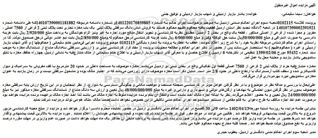 پرونده کلاسه 0102115شعبه سوم اجرای احکام مدنی اردبیل به موجب درخواست اجرای حکم به شماره 1401220170839865و شماره دادنامه مربوطه 140107390001181882که طی دادنامه شماره 140107390002391921 در شعبه 7دادگاه تجدید نظر استان اردبیل قطعیت یافته محکوم علیهم محکوم هستند به فروش شش دانگ سرقفلی پلاک ثبتی یک باب مغازه تجاری تحت پلاک ثبتی 2 فرعی از 7560 اصلی ، مفروز و مجزا شده از فرعی از اصلی مذکور ، قطعه یک واقع در بخش 2 اردبیل مطابق نظریه کارشناسی و تجویز انتقال منافع مورد اجاره به غیر ونیز الزام خواندگان به پرداخت مبلغ 2/920/000 ریال بابت هزینه دادرسی به صورت اشتراکی و مبلغ 50/000/000ریال بابت حق الوکاله وکیل و مبلغ 6/000/000 ریال بابت هزینه کارشناسی درحق محکوم له.ومبلغ 2/850/000ریال بابت نیم عشر دولتی درحق صندوق دولت. لذا در راستای اجرای حکم کارشناس مربوطه نظریه خود را به شرح زیر اعلام نمودند: عطف به اخطاریه پرونده به شماره بایگانی 0102115 موضوع پرونده اجرایی فی مابین خانم سلیمانی ( محکوم لها ) و آقای شهاب بازیار اردبیلی و غیره ( محکوم علیهم ) به استحضار می رساند پس از حضور در دفتر اجرای احکام و مطالعه محتویات پرونده از مفاد قرار کارشناسی مبنی بر ( ارزیابی سرققلی سه دانگ مشاع از ششدانگ مغازه به موجب سند شماره 95432 مورخ 1399/02/06 تنظیمی در دفترخانه 6 اردبیل ) اطلاع حاصل و با معرفی آقای شهاب بازیار اردبیلی و با اطلاع خانم سلیمانی از ملک متنازع فیه به نشانی اردبیل، چهارراه حافظ، مغازه با تابلو ساندویچی یاشار بازدید و معاینه محل به عمل آمد.