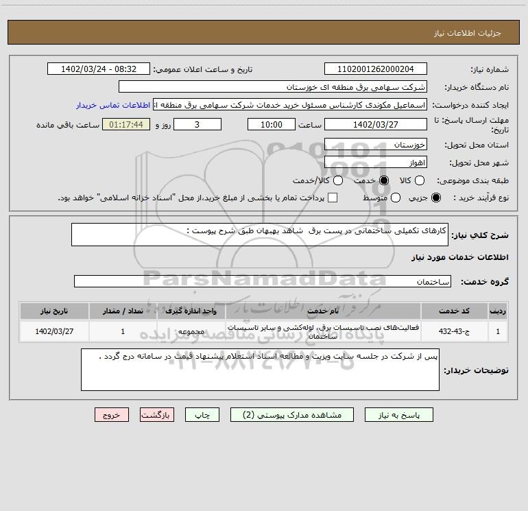شرح کلی نیاز: کارهای تکمیلی ساختمانی در پست برق شاهد بهبهان طبق شرح پیوست :