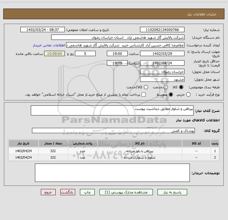 شرح کلی نیاز: پیراهن و شلوار مطابق دیتاشیت پیوست