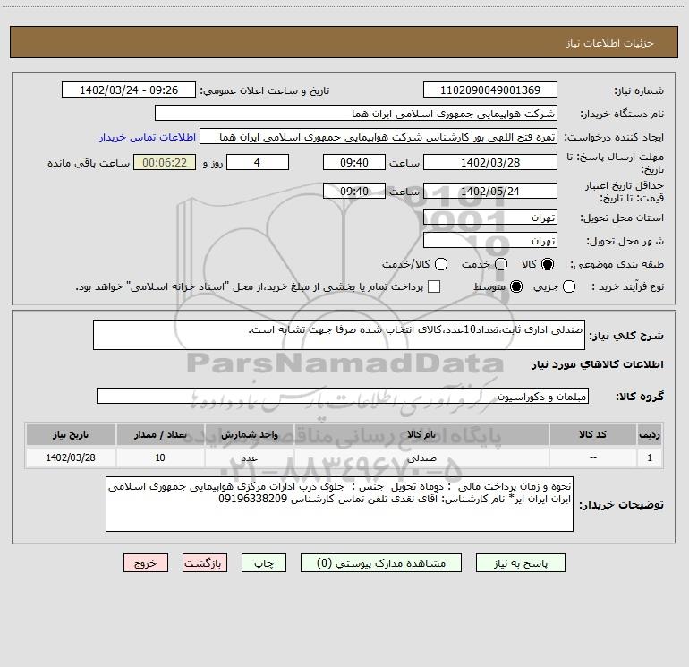 شرح کلی نیاز: صندلی اداری ثابت،تعداد10عدد،کالای انتخاب شده صرفا جهت تشابه است.