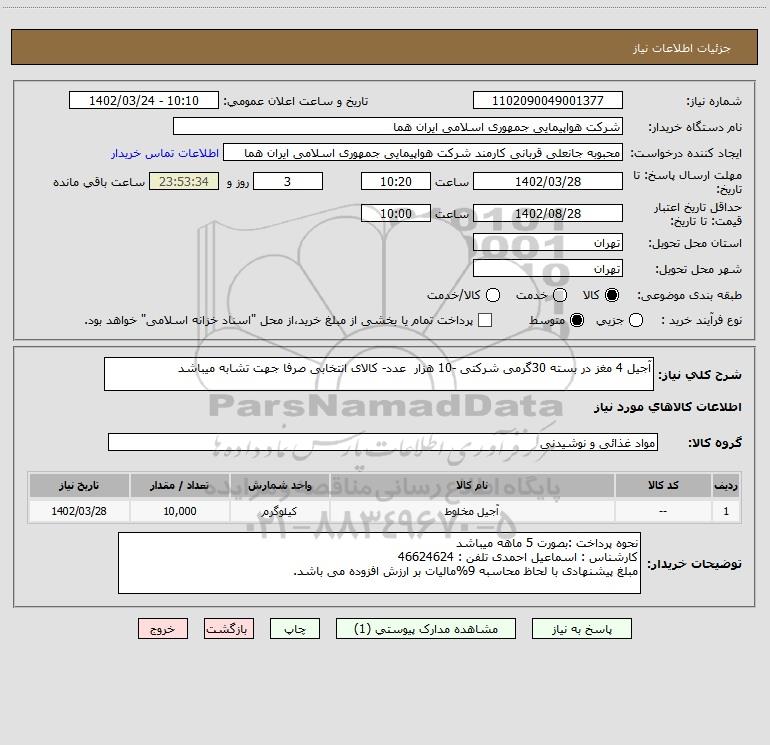 شرح کلی نیاز: آجیل 4 مغز در بسته 30گرمی شرکتی -10 هزار عدد- کالای انتخابی صرفا جهت تشابه میباشد