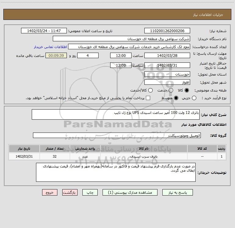| 1 | -- | باتری سرب اسیدی | عدد | 32 | 1402/03/31 |
