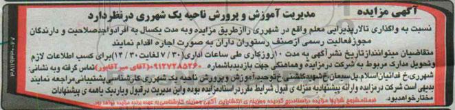 نسبت به واگذاری تالار پذیرایی معلم واقع در شهر ری را ازطریق مزایده و به مدت یک سال به افراد واجد صلاحیت و دارندگان مجوز فعالیت رسمی از صنف رستوران داران به صورت اجاره اقدام نمایند