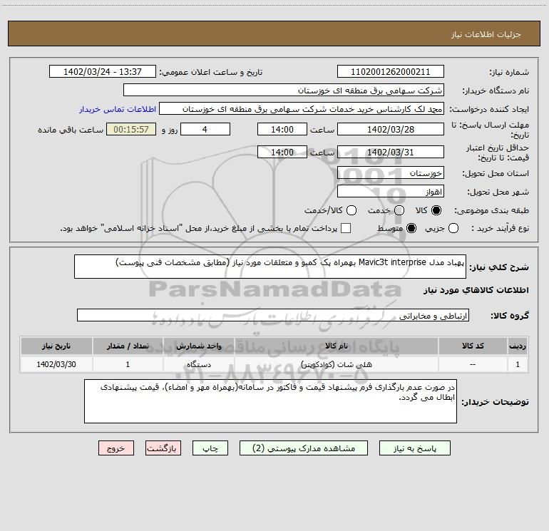 شرح کلی نیاز: پهباد مدل Mavic3t interprise بهمراه پک کمبو و متعلقات مورد نیاز (مطابق مشخصات فنی پیوست)