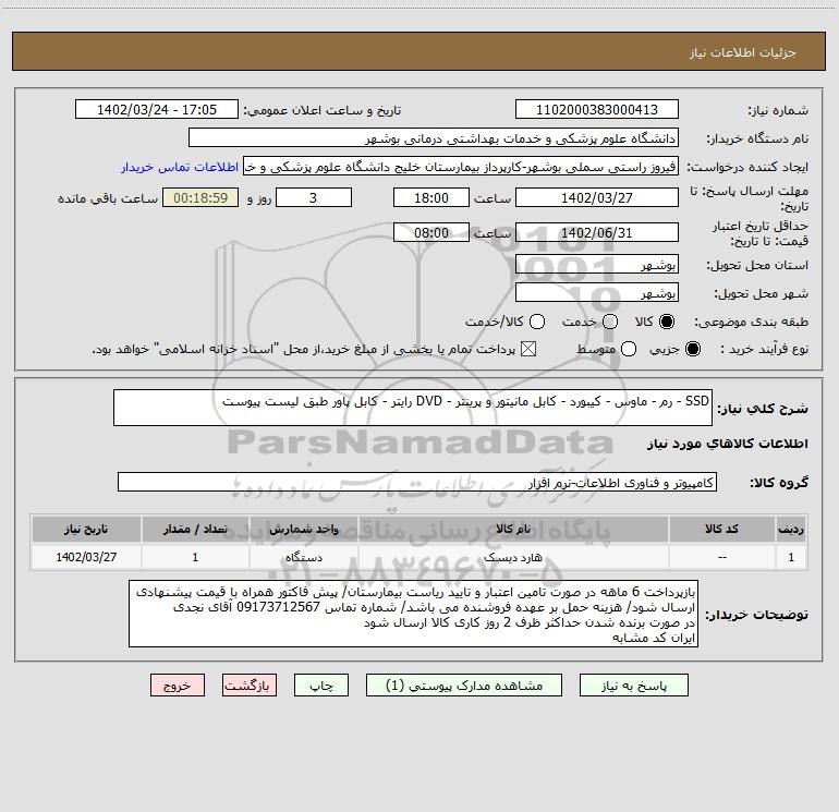 شرح کلی نیاز: SSD - رم - ماوس - کیبورد - کابل مانیتور و پرینتر - DVD رایتر - کابل پاور طبق لیست پیوست