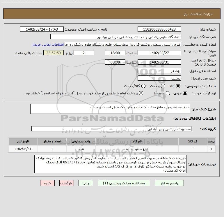 شرح کلی نیاز: مایع دستشویی - مایع سفید کننده - جوهر نمک طبق لیست پیوست