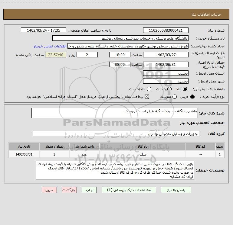 نام دستگاه خریدار:دانشگاه علوم پزشکی و خدمات بهداشتی درمانی بوشهر