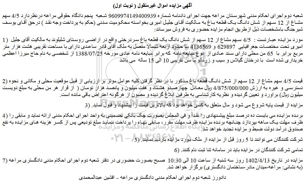 شعبه دوم اجرای احکام مدنی شهرستان مراغه جهت اجرای دادنامه شماره 9609974149400939 شعبه پنجم دادگاه حقوقی مراغه درنظردارد 4/5 سهم مشاع از 12 سهم از شش دانگ یک قطعه باغ به مالکیت آقای جلیل امیری بخواسته محکومیت مدنی (حکم به پرداخت وجه نقد ) درحق آقای یوسف شیرجنگ بامشخصات ذیل ازطریق انجام مزایده حضوری به فروش میرساند: