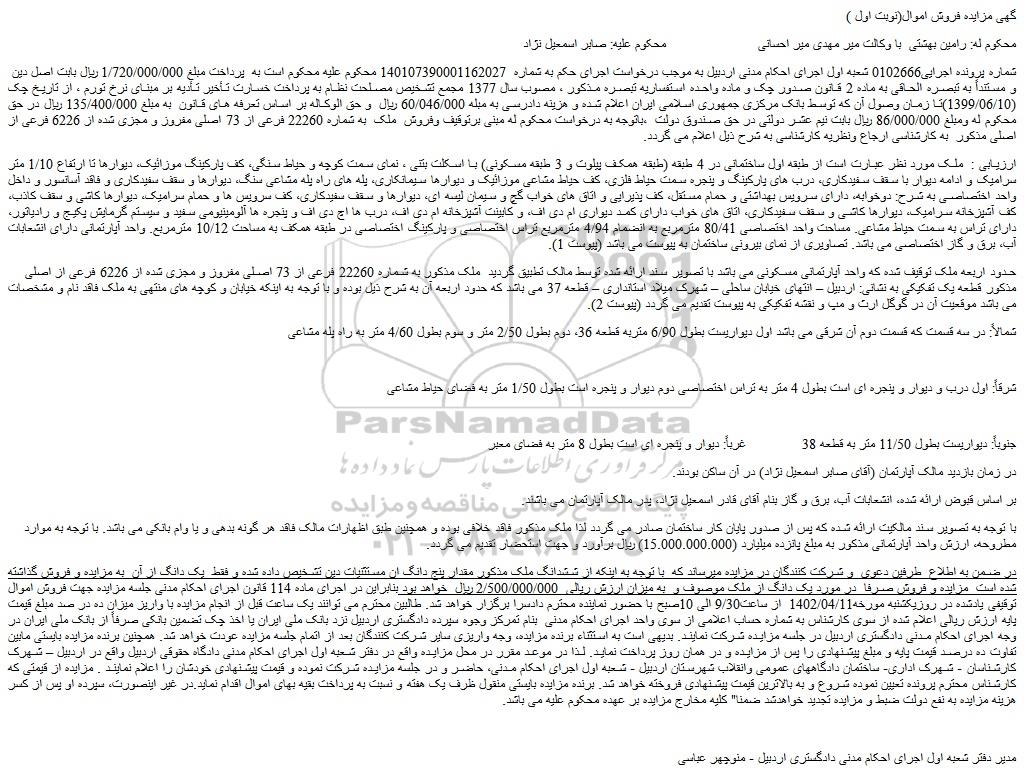 شماره پرونده اجرایی0102666 شعبه اول اجرای احکام مدنی اردبیل به موجب درخواست اجرای حکم به شماره 140107390001162027 محکوم علیه محکوم است به پرداخت مبلغ 1/720/000/000 ریال بابت اصل دین و مستنداً به تبصره الحاقی به ماده 2 قانون صدور چک و ماده واحده استفساریه تبصره مذکور ، مصوب سال 1377 مجمع تشخیص مصلحت نظام به پرداخت خسارت تأخیر تأدیه بر مبنای نرخ تورم ، از تاریخ چک (1399/06/10)تا زمان وصول آن که توسط بانک مرکزی جمهوری اسلامی ایران اعلام شده و هزینه دادرسی به مبله 60/046/000 ریال و حق الوکاله بر اساس تعرفه های قانون به مبلغ 135/400/000 ریال در حق محکوم له ومبلغ 86/000/000 ریال بابت نیم عشر دولتی در حق صندوق دولت ،باتوجه به درخواست محکوم له مبنی برتوقیف وفروش ملک به شماره 22260 فرعی از 73 اصلی مفروز و مجزی شده از 6226 فرعی از اصلی مذکور به کارشناسی ارجاع ونظریه کارشناسی به شرح ذیل اعلام می گردد.