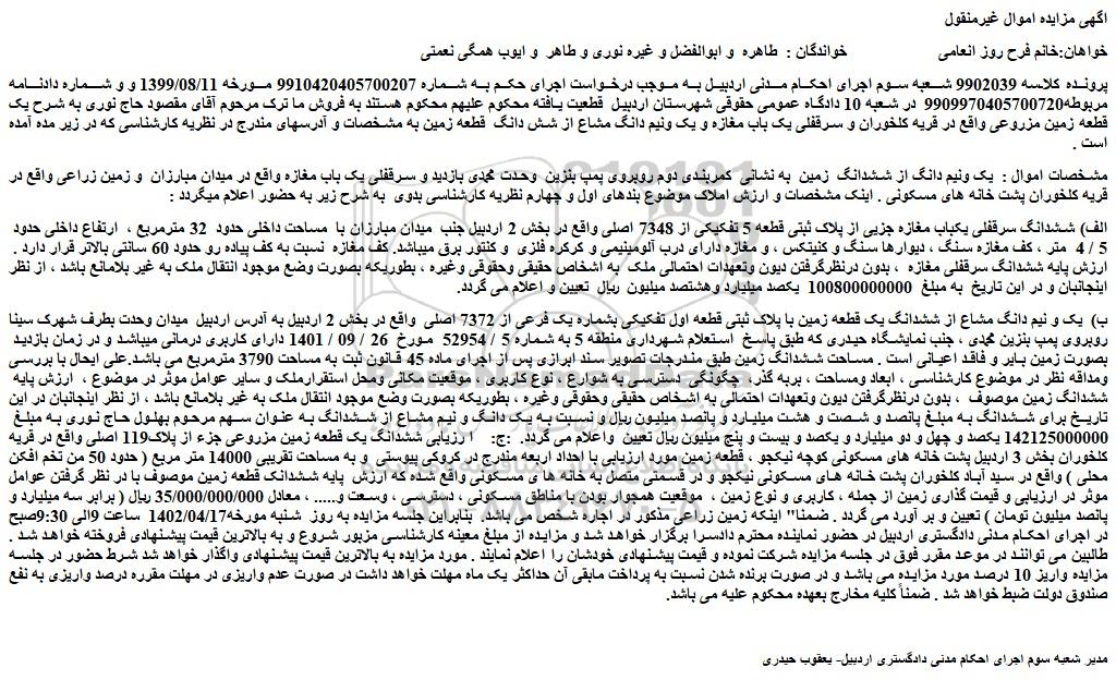 پرونده کلاسه 9902039 شعبه سوم اجرای احکام مدنی اردبیل به موجب درخواست اجرای حکم به شماره 9910420405700207 مورخه 1399/08/11 و و شماره دادنامه مربوطه9909970405700720  در شعبه 10 دادگاه عمومی حقوقی شهرستان اردبیل  قطعیت یافته محکوم علیهم محکوم هستند به فروش ما ترک مرحوم آقای مقصود حاج نوری به شرح یک قطعه زمین مزروعی واقع در قریه کلخوران و سرقفلی یک باب مغازه و یک ونیم دانگ مشاع از شش دانگ  قطعه زمین به مشخصات و آدرسهای مندرج در نظریه کارشناسی که در زیر مده آمده است .