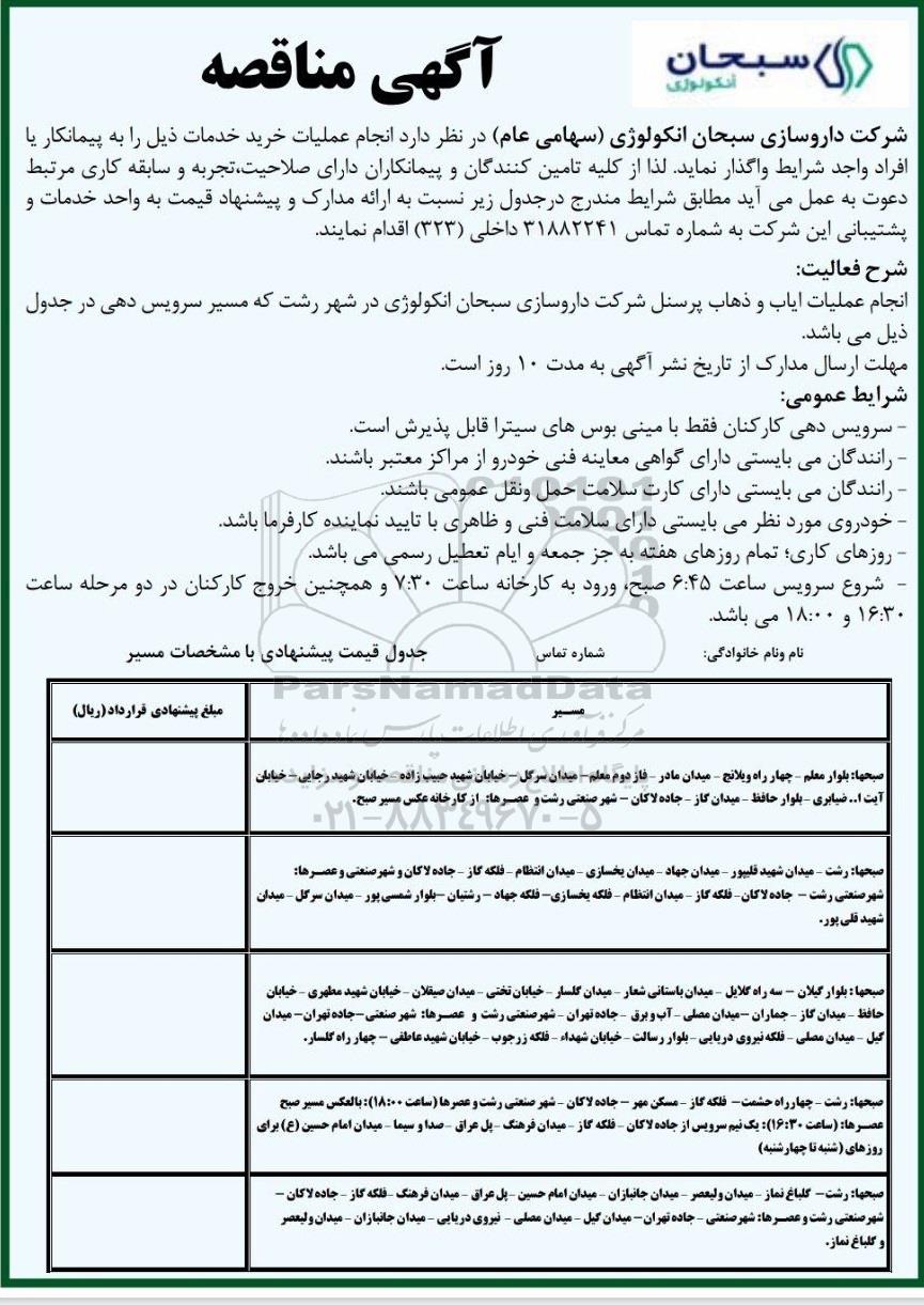 انجام عملیات ایاب و ذهاب پرسنل شرکت داروسازی سبحان انکولوژی در شهر رشت که مسیر سرویس دهی در جدول ذیل می باشد