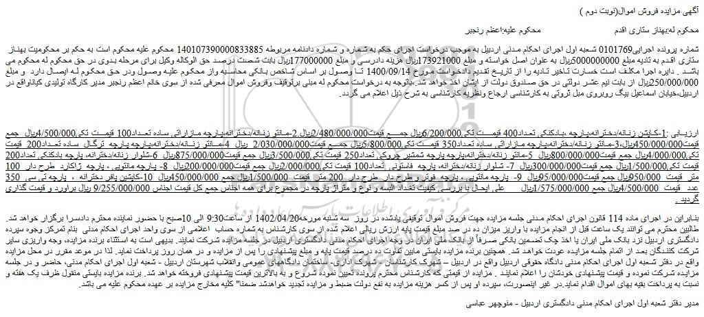 شماره پرونده اجرایی0101769 شعبه اول اجرای احکام مدنی اردبیل به موجب درخواست اجرای حکم به شماره و شماره دادنامه مربوطه 140107390000833885 محکوم علیه محکوم است به حکم بر محکومیت بهناز ستاری اقدم به تادیه مبلغ 5000000000ریال به عنوان اصل خواسته و مبلغ 173921000ریال هزینه دادرسی و مبلغ 177000000ریال بابت شصت درصد حق الوکاله وکیل برای مرحله بدوی در حق محکوم له محکوم می باشد . دایره اجرا مکلف است خسارت تاخیر تادیه را از تاریخ تقدیم دادخواست مورخ 1400/09/14 تا وصول بر اساس شاخص بانکی محاسبه واز محکوم علیه وصول ودر حق محکوم له ایصال دارد و مبلغ 250/000/000ریال از بابت نیم عشر دولتی در حق صندوق دولت از ایشان اخذ خواهد شد.،باتوجه به درخواست محکوم له مبنی برتوقیف وفروش اموال معرفی شده از سوی خانم اعظم رنجبر مدیر کارگاه تولیدی کیاناواقع در اردبیل،خیابان اسماعیل بیگ روبروی مبل ثروتی به کارشناسی ارجاع ونظریه کارشناسی به شرح ذیل اعلام می گردد.
