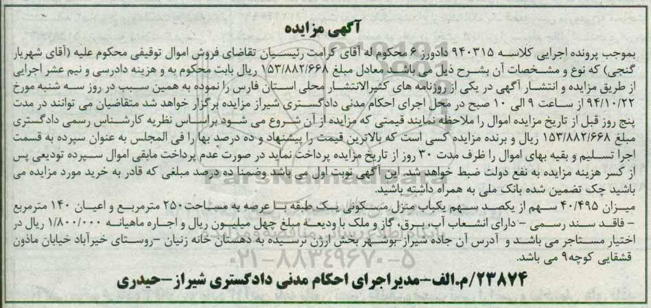 مزایده کلاسه 940315 میزان 40.495 سهم از یک صد سهم یکباب منزل مسکونی