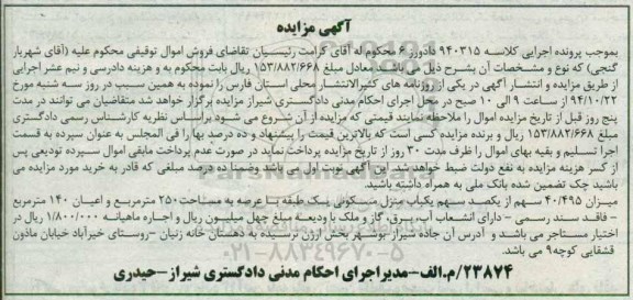 مزایده:سه شنبه ساعت نه الی ده 94.10.22