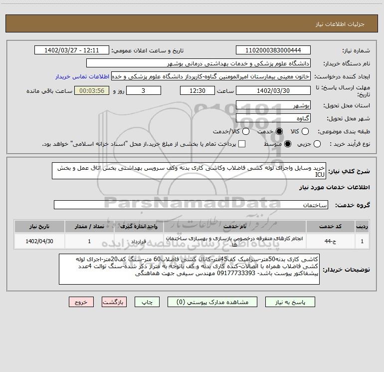 شرح کلی نیاز: خرید وسایل واجرای لوله کشی فاضلاب وکاشی کاری بدنه وکف سرویس بهداشتی بخش اتاق عمل و بخش ICU