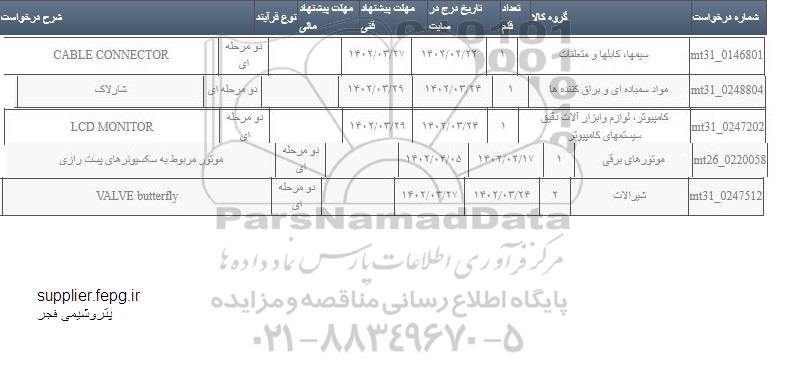 | mt31-0247202 | کامپیوتر، لوازم و ابزار الات دقیق سیستمهای کامپیوتر | 2 | 1402.3.29 | دو مرحله ای | LCD MONITOR |