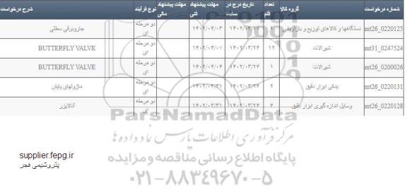 | mt26-0220131 | یدکی ابزار دقیق | 2 | 1402.3.31 | دو مرحله ای | ماژولهای پایش |