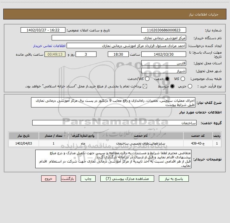 شرح کلی نیاز: اجرای عملیات سرویس، تعمیرات، راه اندازی و رفع معایب 9 دژنکتور در پست برق مرکز آموزشی درمانی نمازی طبق شرایط پیوست