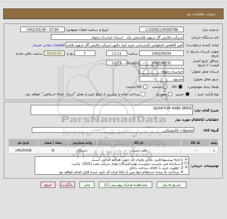 شرح کلی نیاز: QUANTUM HARD DRIVE