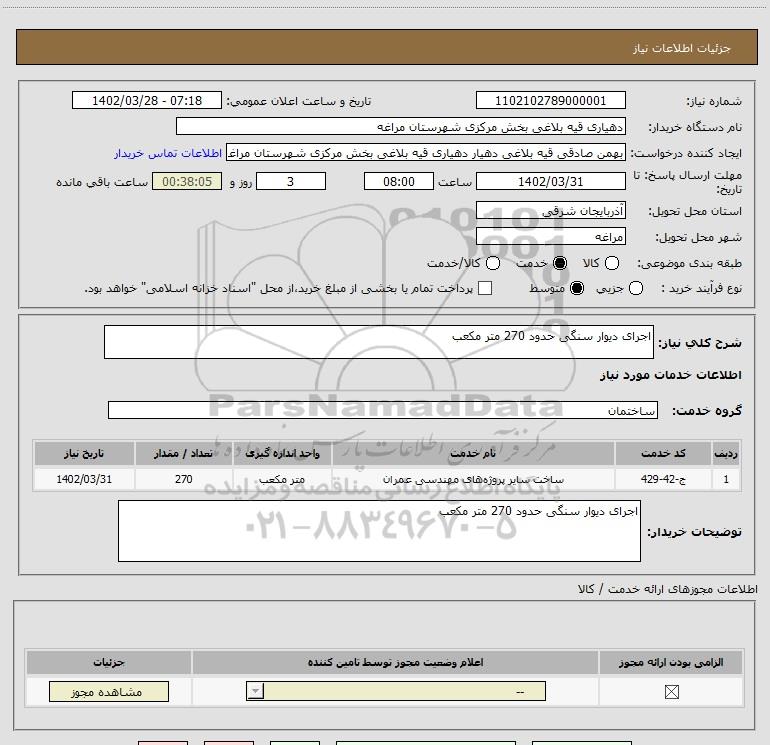 شرح کلی نیاز: اجرای دیوار سنگی حدود 270 متر مکعب